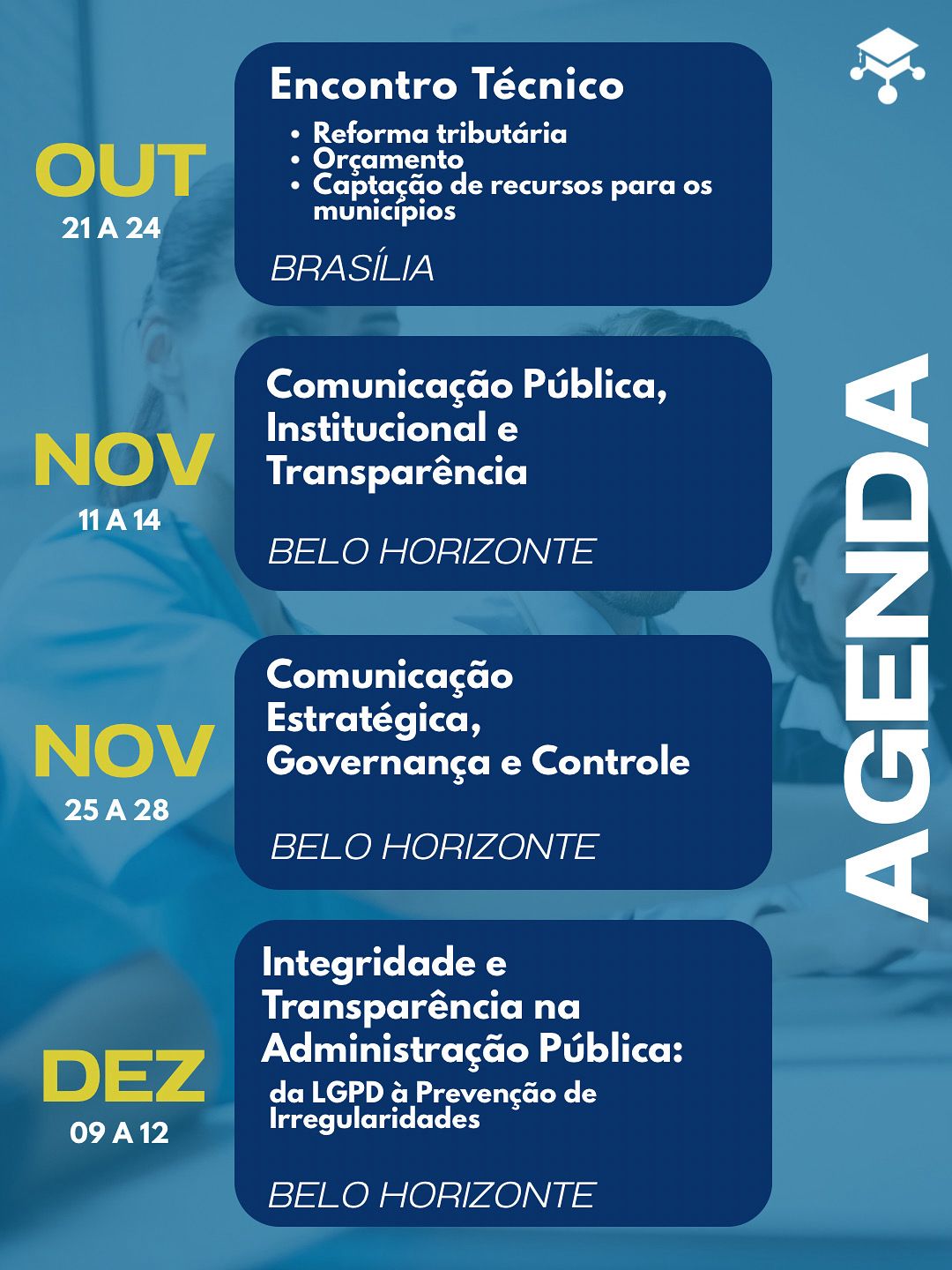 A agenda de capacitações 2025 foi construída para atender demandas com conteúdos de alto nível, metodologias aplicadas e foco em resultados concretos para a administração municipal.